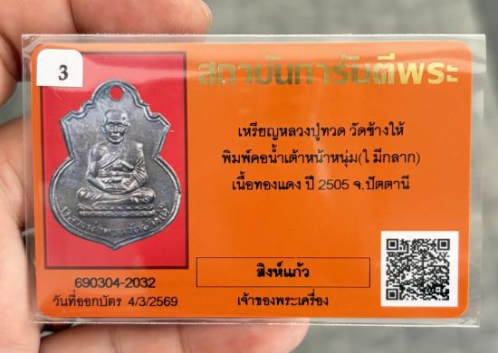 เหรียญน้ำเต้าหน้าหนุ่ม หลวงปู่ทวด ปี๒๕o๕ (ใ มีกลาก) เนื้อทองแดง สวยเดิม พร้อมบัตรรับรอง