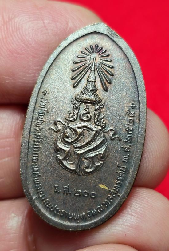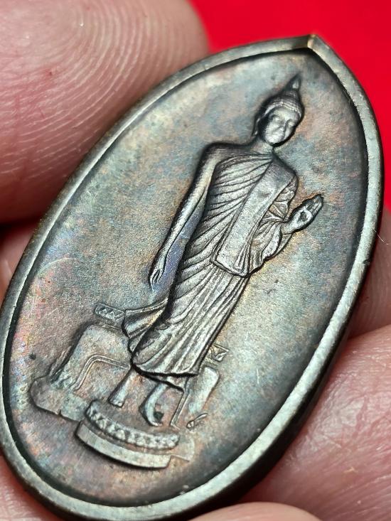 เหรียญทองแดงรมดำ พระ 25 ศตวรรษ พระศรีศากยะทศพลญาณ ประธานพุทธมณฑลสุทรรศน์ ปางลีลา ด้านหลัง อัญเชิญพระปรมาภิไธย ย่อ ภปร สร้างในงานสมโภชกรุงรัตนโกสินทร์ครบ 200 ปี จ.นครปฐม พ.ศ. 2525 |