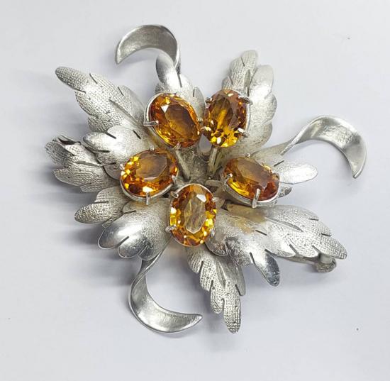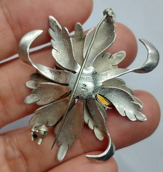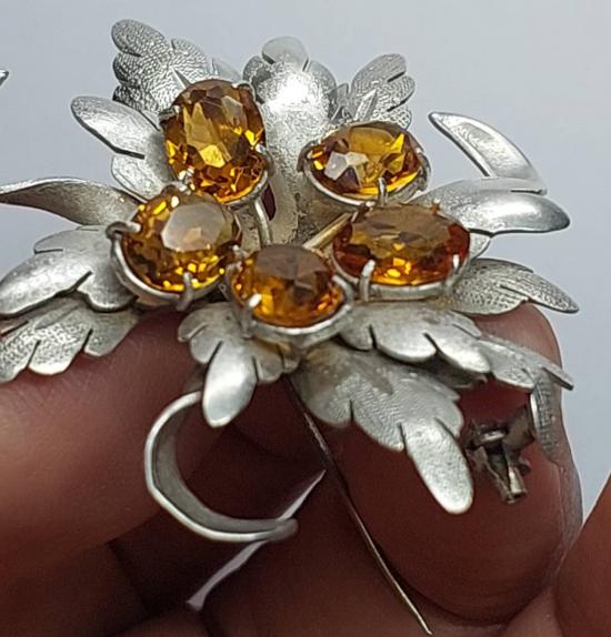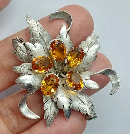 เข็มกลัดโบราณ รูปดอกไม้ทำจากเงิน ฝังพลอยสีเหลือง ทำเป็นจี้ได้ งานนอก |