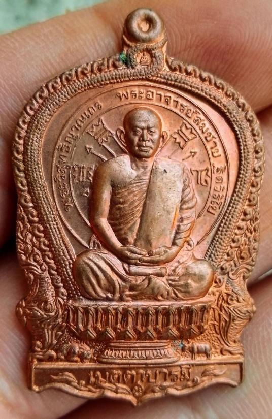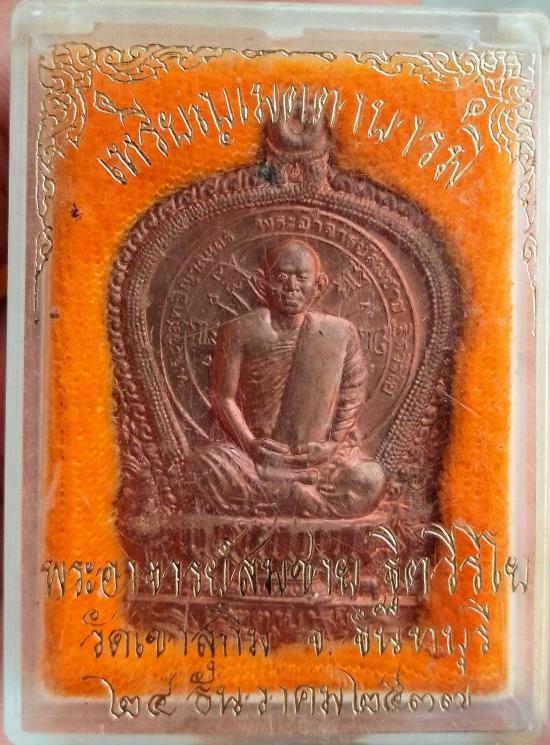 เหรียญนั่งพานเมตตาบารมี หลวงพ่อสมชายวัดเขาสุกิมจังหวัดจันทบุรีปี 2537 ตอก Number 21068 พร้อมกล่องเดิม