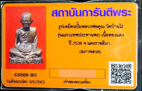 รูปหล่อเทพประทานพร รุ่นแรก หลวงพ่อคูณ วัดบ้านไร่ ปี 2536 เนื้อทองแดง (บัตรสภาพสวย)