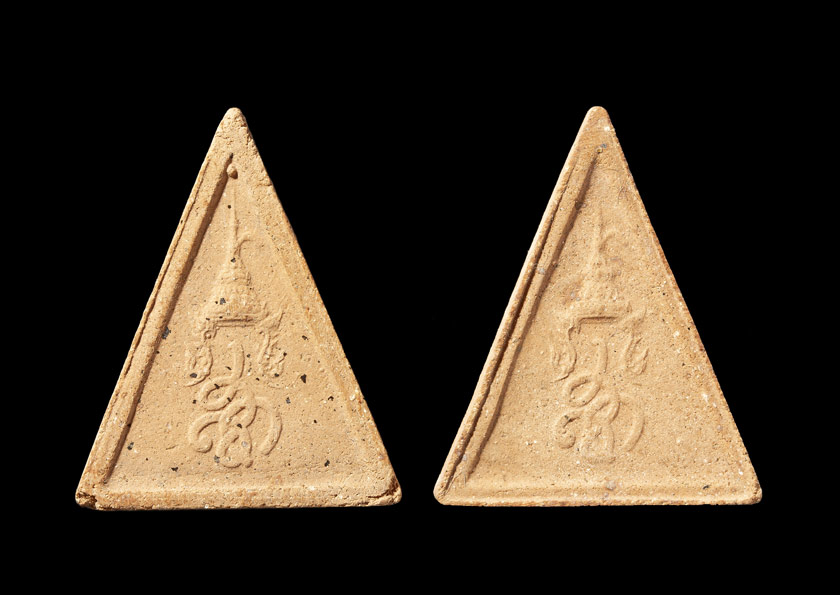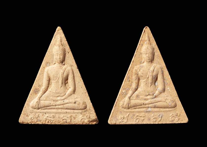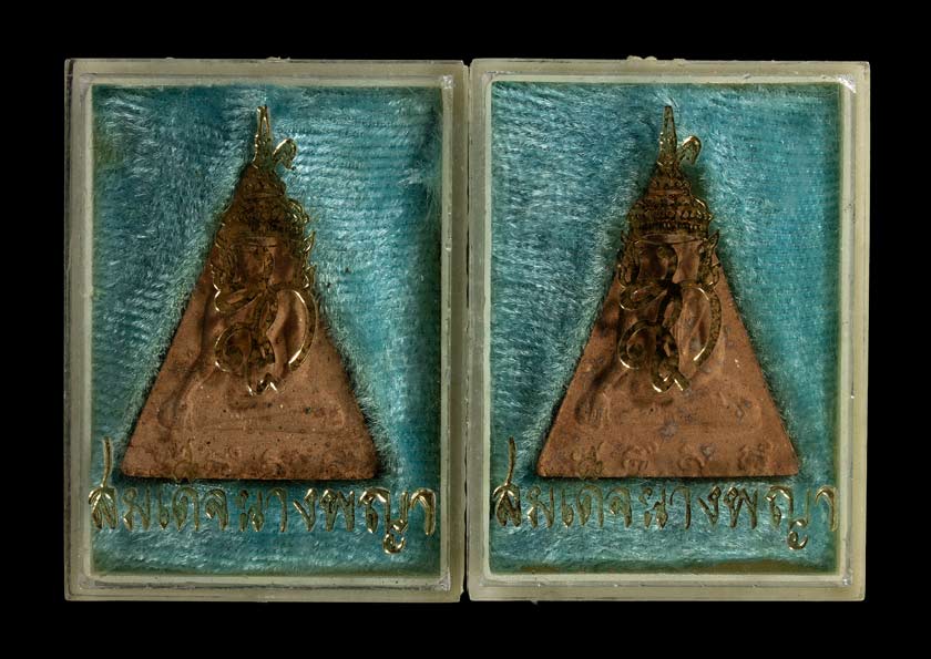 พุทธลักษณะจำลองจากพระนางพญาเสน่ห์จันทร์ กรุสุโขทัย ด้านหน้ามีข้อความ เอ ตัง สะ ติง ส่วนด้านหลังประดับพระปรมาภิไธย ส.ก. ใต้พระมหามงกุฎ |