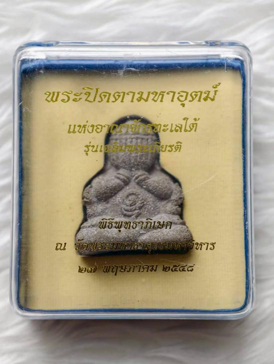 เริ่ม100 พระปิดตามหาอุตม์ แห่งอาณาจักรทะเลใต้ รุ่นเฉลิมพระเกียรติ ปี2548 จัดสร้างโดยวัดมหาธาตุวรมหาวิหาร เนื้อผงใบลาน ใต้ฐานบรรจุตะกรุดเงินคู่ ตอกโค้ด และยิงเลเซอร์หมายเลข 810