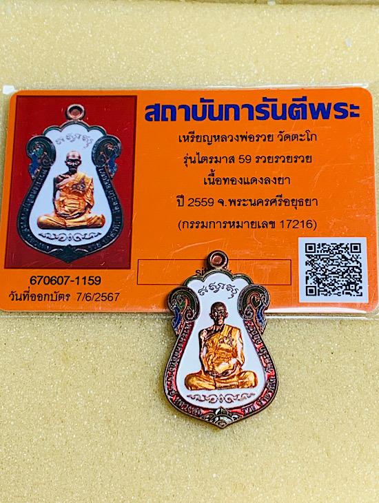 หลวงพ่อรวย วัดตะโก รุ่นไตรมาส5995 เนื้อทองแดงลงยาชุดกรรมการ พร้อมบัตรครับ