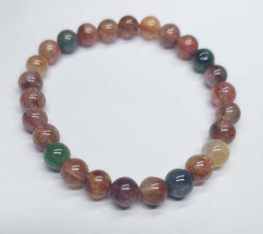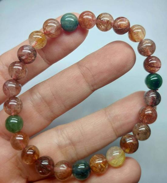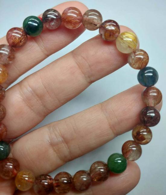 ข้อมือไหม 5 สี (Multicolor Rutilated Quartz) 8 มิล (เนื้อใสไหมแน่น) เป็นหินมงคลยอดนิยมที่เชื่อว่าเป็น "ราชาแห่งความมั่งคั่ง" รวมพลังของหินไหม 5 ชนิด