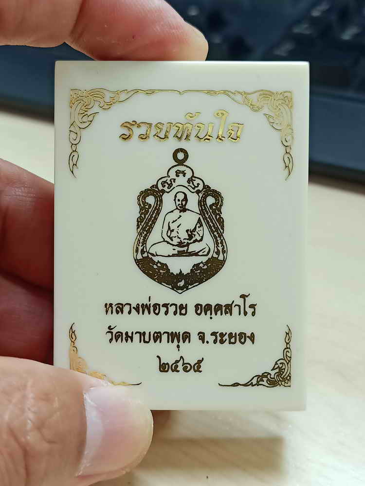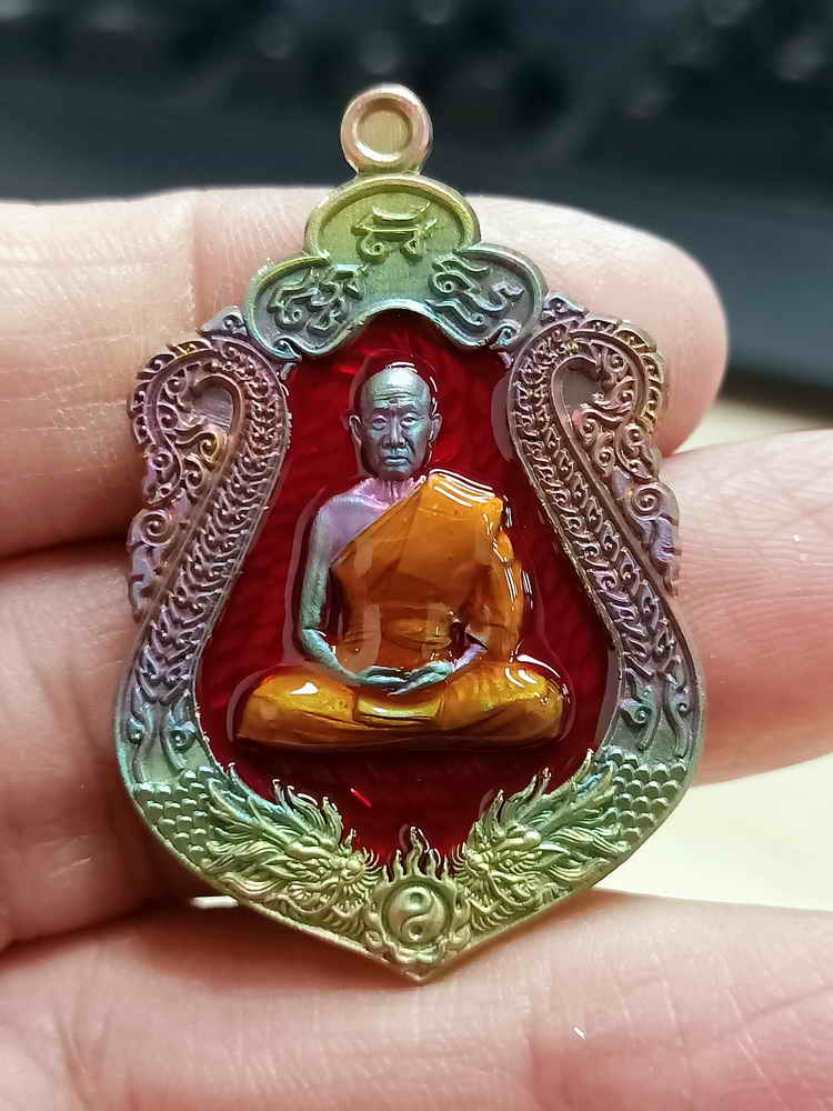 วัดใจ 100 เหรียญเสมารวยทันใจ หลวงพ่อรวย วัดมาบตาพุด จ.ระยอง ปี 2565 ชนวนผิวรุ้ง ลงยาแดง หมายเลข 5 กล่องเดิม |