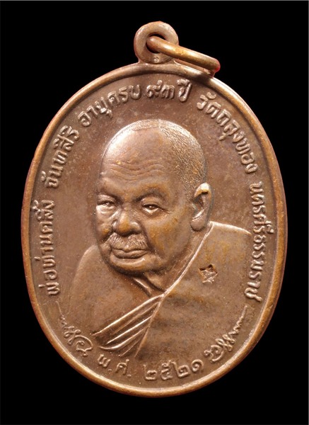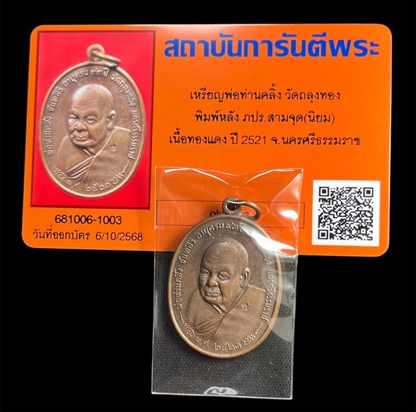 เหรียญพ่อท่านคลิ้ง วัดถลุงทอง พิมพ์หลัง ภปร. สามจุด(นิยม) เนื้อทองแดง ปี 2521 จ.นครศรีธรรมราช พร้อมบัตรรับรอง
