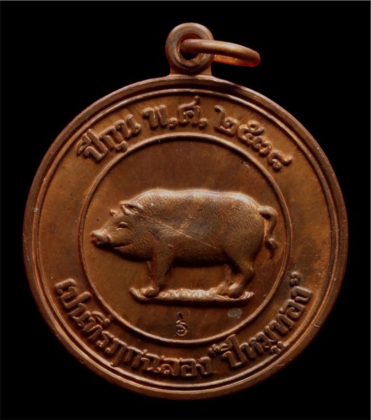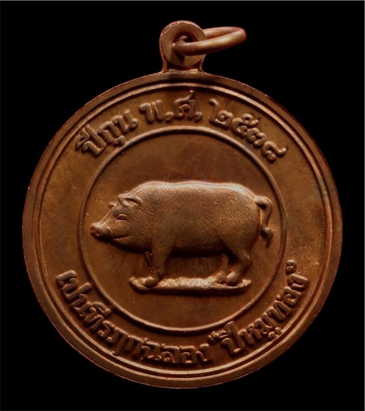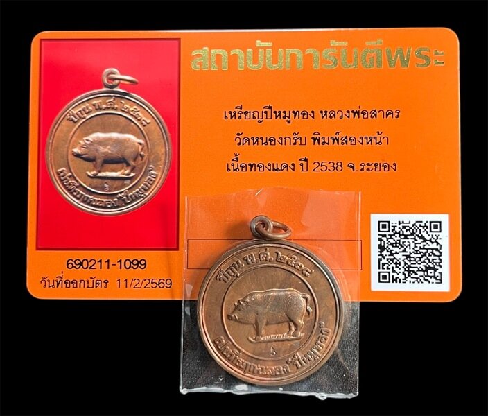 เหรียญปีหมูทอง หลวงพ่อสาคร วัดหนองกรับ พิมพ์สองหน้า เนื้อทองแดง ปี 2538 จ.ระยอง สภาพสวยเดิม พร้อมบัตรรับรอง