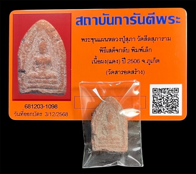 พระขุนแผนหลวงปู่สุภา วัดสีลสุภาราม พิธีเสด็จกลับ พิมพ์เล็ก เนื้อผง(แดง) ปี 2506 จ.ภูเก็ต (วัดสารอดสร้าง) พร้อมบัตรรับรอง