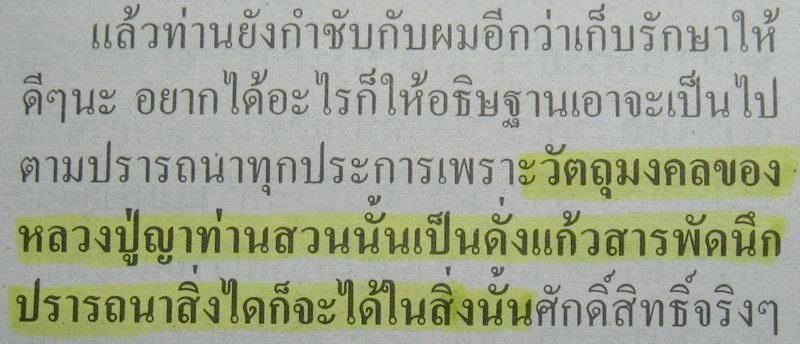 => วัตถุมงคลของหลวงปู่ญาท่านสวนนั้น เป็นดั่งแก้วสารพัดนึก ปราถนาสิ่งใดก็จะได้ในสิ่งนั้น ( คำบรรยาย จากนิตยสารพระเครื่องฉบับหนึ่ง กล่าวถึงวัตถุมงคล หลวงปู่ญาท่านสวน ฉนฺทโร )