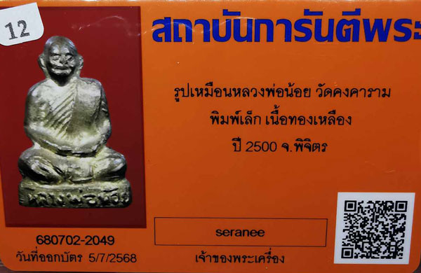 รูปเหมือนหลวงพ่อน้อย วัดคงคาราม พิมพ์เล็ก เนื้อทองเหลือง ปี2500 จ.พิจิตร + บัตรG-pra สภาพเดิมค่ะ