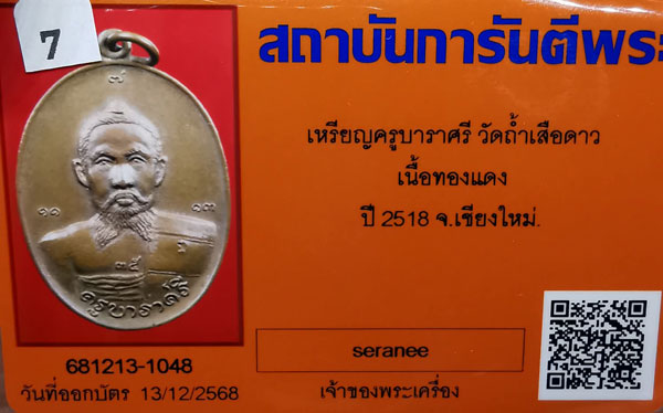 เหรียญครูบาราศรี วัดถ้ำเสือดาว เนื้อทองแดง ห่วงเดิม ปี2518 จ.เชียงใหม่ + บัตรG-pra สภาพเดิมค่ะ