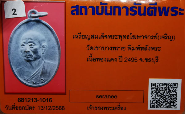 เหรียญพ.ฆ.อ สมเด็จพระพุทธโฆษาจารย์(เจริญ) วัดเขาบางทราย จ.ชลบุรี พิมพ์หลังพระ เนื้อทองแดง ห่วงเดิม ปี2495 (ท่านเจ้าคุณนรฯ อธิษฐานจิต) + บัตรG-pra สภาพเดิมค่ะ