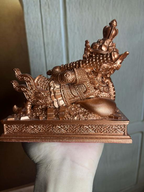 แร่เหล็กน้ำพี้ งานวัด กุเวรน้อยปางนอนเสวยสุข พระอาจารย์เชษฐ์ วัดถวิลศิลามงคล กายเปลี่ยนสีตามอุณภูมิ พร้อมกล่องเดิมสูง 5.5 นิ้ว เนื้อแร่เหล็กน้ำพี้ แม่เหล็กดูดติดได้ |
