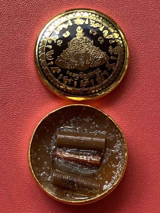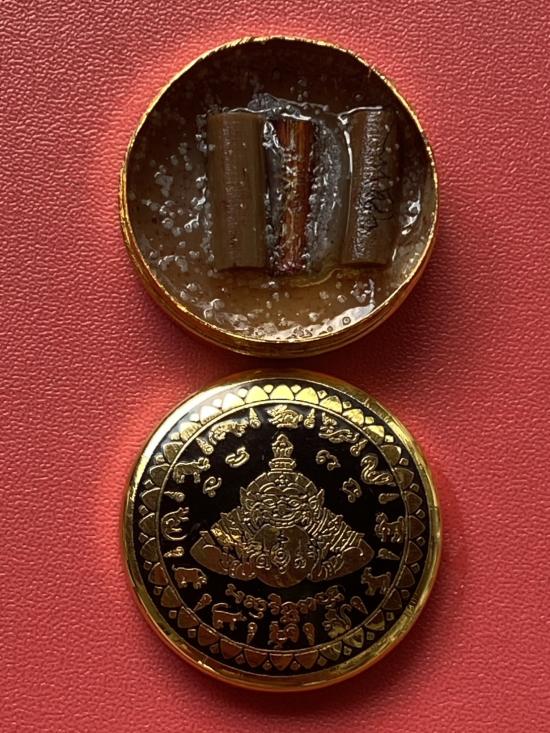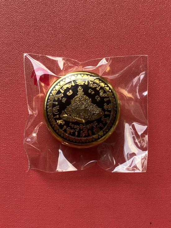 เคาะเดียวแดง สีผึ้งพระราหู รุ่น มงคลจักรวาล เนื้อ โลหะชุบทองลงยาสีดำขอบสีดำ ขนาด3.2ซม |