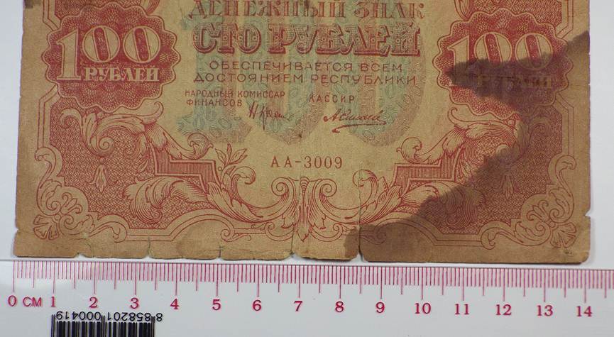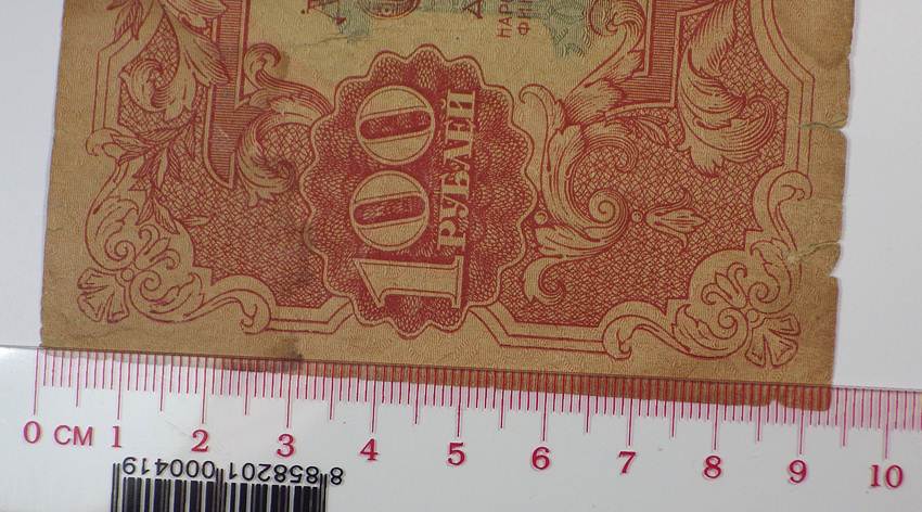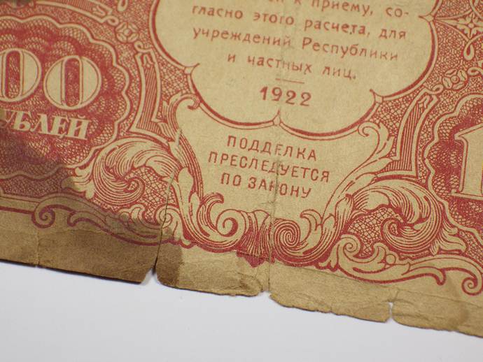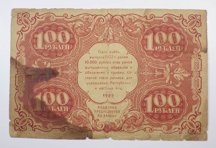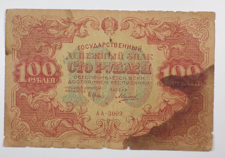 ธนบัตรเก่าของสหภาพโซเวียต ชนิดราคา 100 รูเบิล ปีค.ศ. 1922 สภาพตามรุปครับ เคาะแรกเเดง |