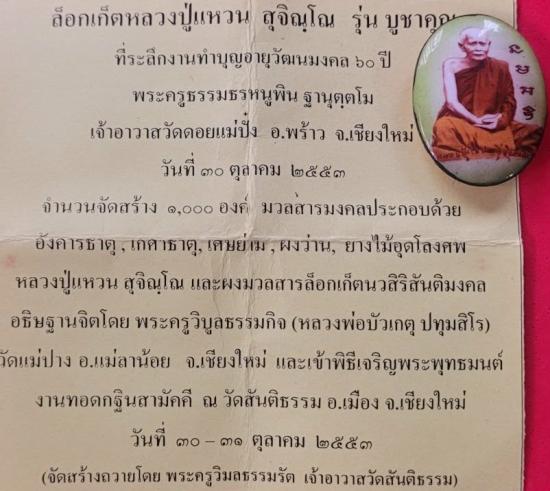 ล็อกเก็ตหลวงปู่แหวน สุจิณโณ รุ่นบูชาครู ที่ระลึกงานทำบุญอายุวัฒนมงคล 60 ปี พระครูธรรมธรหนูพิน ฐานุตตโม เจ้าอาวาสวัดดอยแม่ปั๋ง อ.พร้าว จ.เชียงใหม่ สร้างเพียง 1000 องค์ |