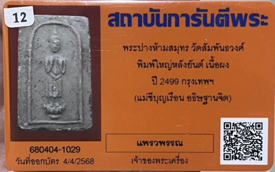 พระมงคลมหาลาภพิมพ์ใหญ่ปางห้ามสมุทรวันจันทร์เนื้อผงปี2499.พระสภาพสวยเดิมๆสมบูรณ์ดีคะ.พร้อมบัตรตรวจสอบเรียบร้อยแล้วคะ