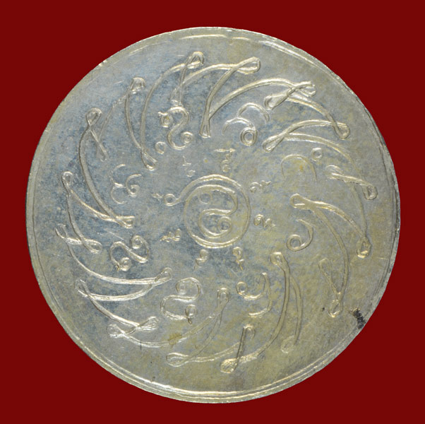 ด้านหลังเหรียญ เป็นรูปยันต์กงจักร มีอักษรจารึก มรรค 8 อักขระขอมที่ปรากฏ คือ