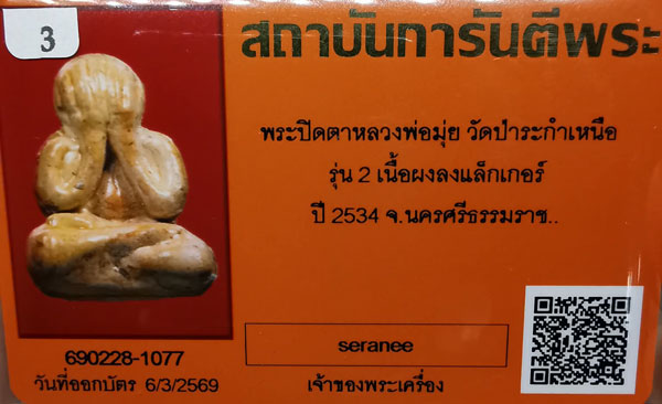 พระปิดตาหลวงพ่อมุ่ย วัดป่าระกำเหนือ รุ่น 2 เนื้อผงลงแล๊กเกอร์ ปี2534 จ.นครศรีธรรมราช + บัตรG-pra สภาพสวยเดิมค่ะ |