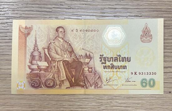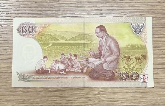 ธนบัตรที่ระลึกเฉลิมพระเกียรติ ในหลวงรัชกาลที่ 9 เนื่องในโอกาสฉลองสิริราชสมบัติครบ 60 ปี ชนิด 60 บาท |