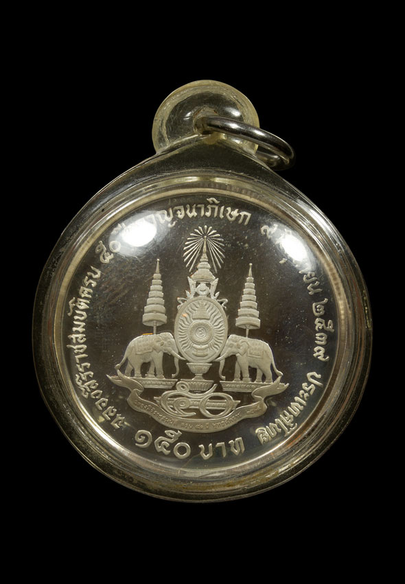 เหรียญเงินขัดเงา ฉลองสิริราชสมบัติครบ ๕๐ ปี กาญจนาภิเษก" ปี 2539 ชนิดราคา 150 บาท เลี่ยมกันน้ำ |