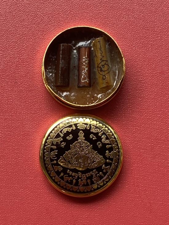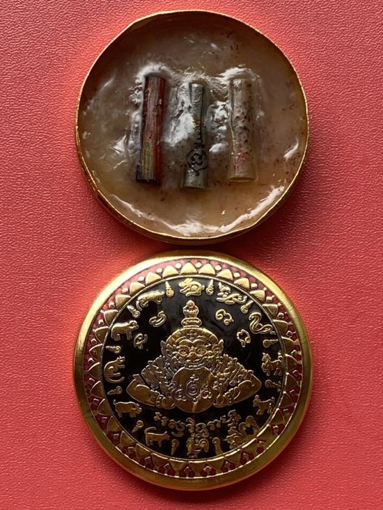 เคาะเดียวแดง สีผึ้งพระราหู รุ่น มงคลจักรวาล เนื้อ โลหะชุบทองลงยาสีดำขอบสีแดง ขนาด3.2ซม |