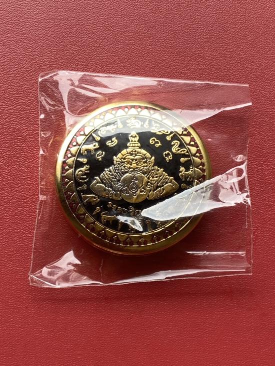 เคาะเดียวแดง สีผึ้งพระราหู รุ่น มงคลจักรวาล เนื้อ โลหะชุบทองลงยาสีดำขอบสีแดง ขนาด5ซม |