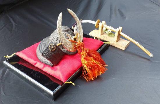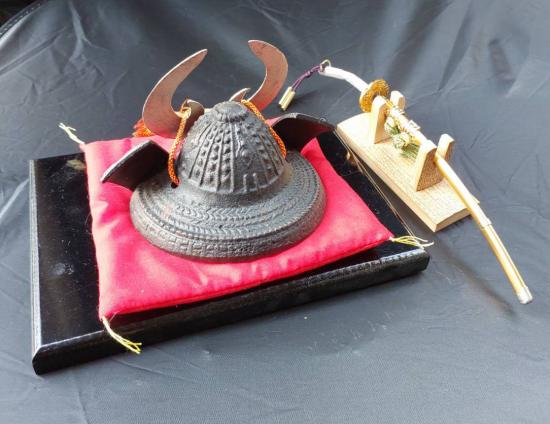***วัดใจ***หมวกซามูไรจำลองของโทกูงาวะ อิเอยาซุ (Tokugawa Ieyasu) ขนาดเล็ก เหล็กหล่อ งานเก่าญี่ปุ่น งานสะสม พร้อมแท่นที่รอง และพร้อมดาบคาตานะจำลอ
