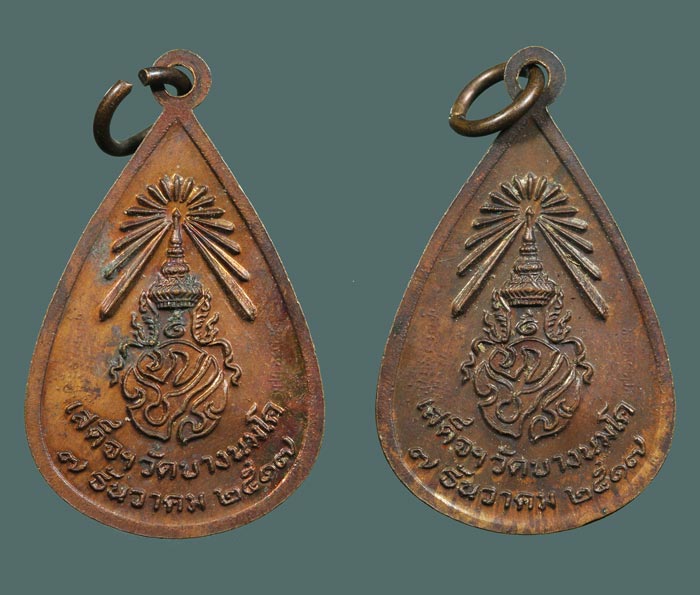 เหรียญรูปหยดน้ำ หลวงพ่อปาน หลัง ภปร. ที่ระลึก ในหลวงรัชกาลที่ 9 เสด็จฯ วัดบางนมโค เมื่อวันที่ 7ธันวาคม 2517 สวย เดิมๆ 2 เหรียญ |