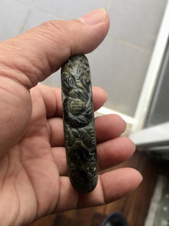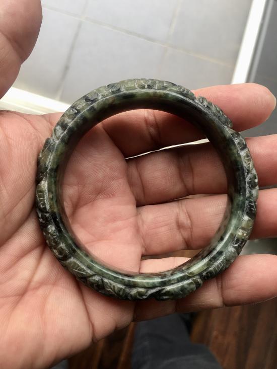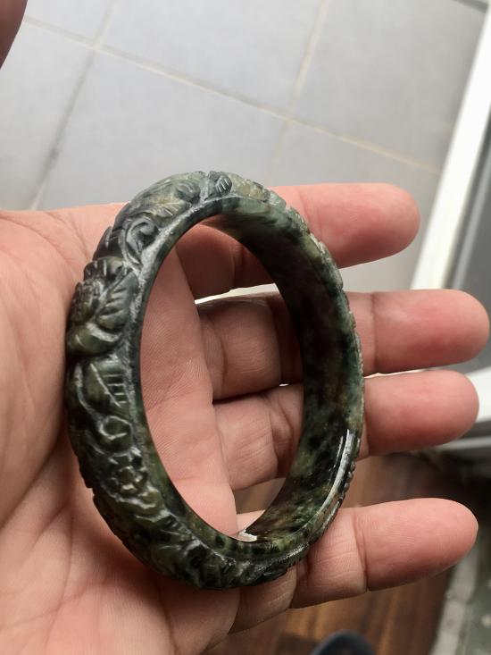 กำไลหยกพม่าแท้ แกะลายดอกไม้ และเถาวัลย์เกี่ยวทรัพย์ สีเขียวดำ ธรรมชาติ Type A (ไม่ผ่านการทำสีหรืออาบน้ำ) ทรงท้องปลิง วงใน 58 mm |