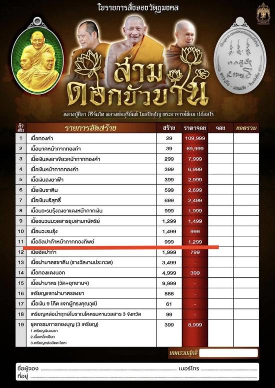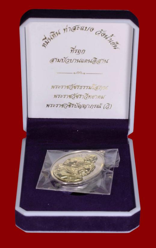 เนื้ออัลปาก้าหน้ากากทองทิพย์ จำนวนสร้าง 999 เหรียญ เหรียญสามดอกบัวบาน หลวงปู่เจ้าคุณมหาศิลา วัดพระธาตุหมื่นหิน จ.กาฬสินธุ์ หลวงพ่อสุริยันต์ วัดป่าวังน้ำเย็น จ.มหาสารคาม พระอาจารย์ต้อม วัดท่าสะแบง จ.ร้อยเอ็ด