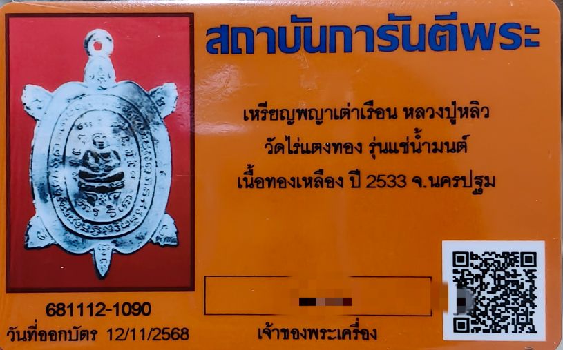 เหรียญพญาเต่าเรือน หลวงปู่หลิว วัดไร่แตงทอง รุ่นแช่น้ำมนต์ เนื้อทองเหลือง ปี2533 จ.นครปฐม +บัตรรับรอง