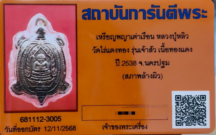เหรียญพญาเต่าเรือน หลวงปู่หลิว วัดไร่แตงทอง รุ่นเจ้าสัว เนื้อทองแดง ปี2538 จ.นครปฐม +บัตรรัฐรอง บัตรระบุ (สภาพล้างผิว) ส่วนตัวดูแล้วสวย สภาพเดิมๆนะคับ ดูให้ชอบก่อนนะคับ