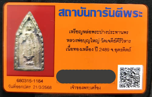 เหรียญหล่อพระปางประทานพร หลวงพ่อบุญใหญ่ วัดเจดีย์คีรีวิหาร เนื้อทองเหลือง ปี2489 จ.อุตรดิตถ์ +บัตรรับรอง
