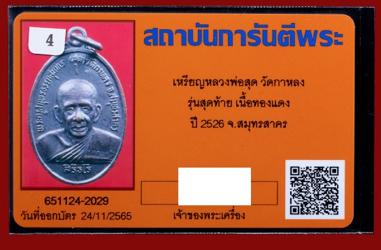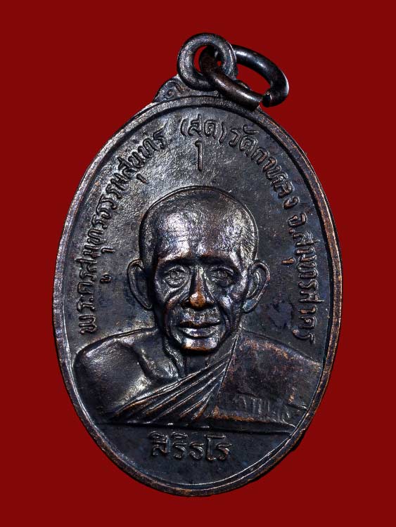 เหรียญหลวงพ่อสุด วัดกาหลง รุ่นสุดท้าย เนื้อทองแดง ปี 2526 จ.สมุทรสาคร พร้อมบัตร No.2029 |