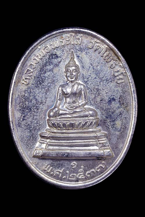 เหรียญหลวงพ่อพระใส หลังหลวงพ่อคูณ รุ่น สร้างศาลาหลวงพ่อพระใส ( เนื้อนิกเกิลกะไหล่เงิน ) พ.ศ.2537 ( ตลับเดิม ) |