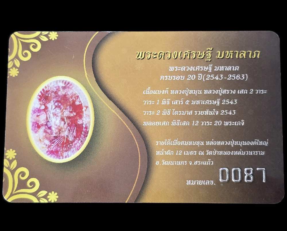ของหายาก พระดวงเศรษฐี ครบรอบ 20 ปี (ดวงเศรษฐี 2020)เนื้อแบงค์ ลป.หมุน ลป.สรวงเสก พลอยเสก 20 วาระ เลข 0087 พร้อมบัตรแข็งอย่างดี พร้อมกล่องเดิม |