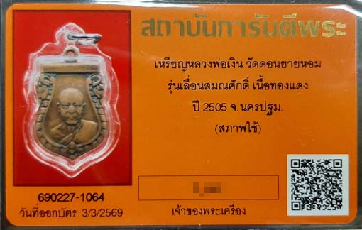 เหรียญเลื่อนสมณศักดิ์ หลวพ่อเงิน เนื้อทองแดง ปี2505 วัดดอนยายหอม จ.นครปฐม พร้อมบัตรรับรองครับ |