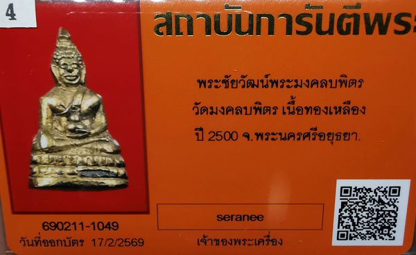 พระชัยวัฒน์พระมงคลบพิตร วัดมงคลบพิตร เนื้อทองเหลือง กริ่งดัง ปี2500 จ.พระนครศรีอยุธยา + บัตรG-pra สภาพเดิมค่ะ |