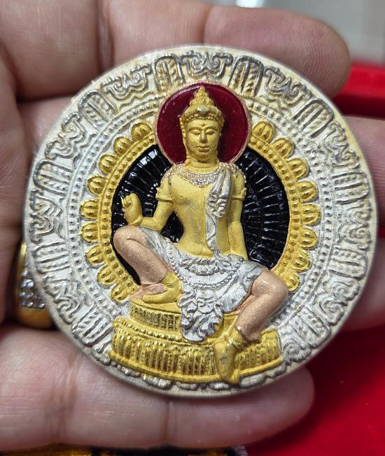 พุทธลักษณะ: ด้านหน้าเป็นรูปองค์พ่อจตุคามรามเทพประทับนั่งในท่ามหาราชลีลา แวดล้อมด้วยลวดลายกงล้อธรรมจักร (ธัมมจักกัปปวัตตนสูตร)
