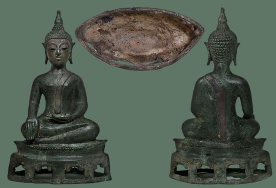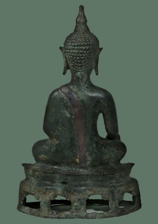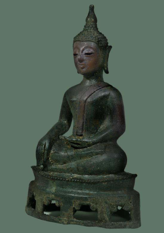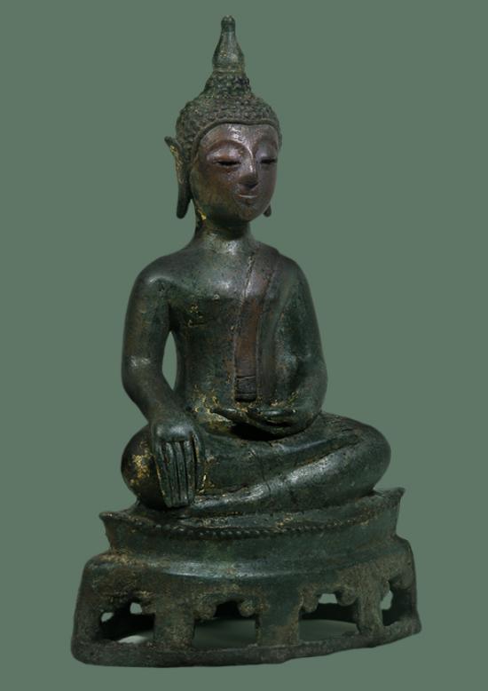 พระพุทธรูปสำริดปางมารวิไชย สมัยเชียงแสนแบบสิงห์๓ ฐานสำเภา เจาะลายประแจจีน สนิมเขียวหยก(ลงกรุ) อายุราว ศตวรรษที่ 21-23 อายุราว 300-400 ปี ลงรักปิดทองแล้วขัดผิวโบราณ (ผิวขัดเก่า) ผิวหิ้งๆเดิมๆ ไม่มีอุด