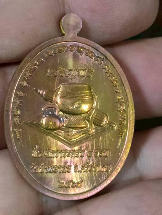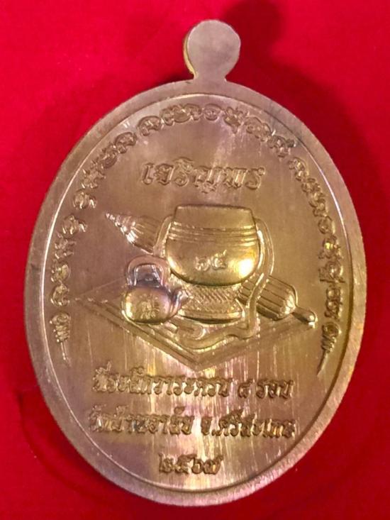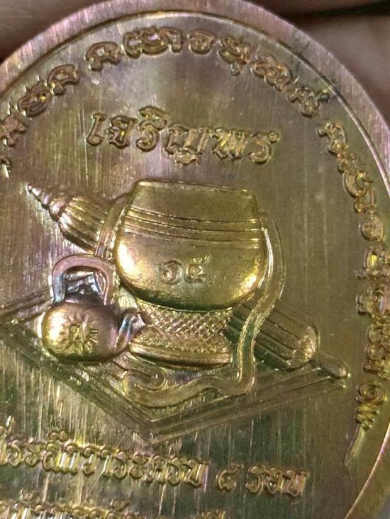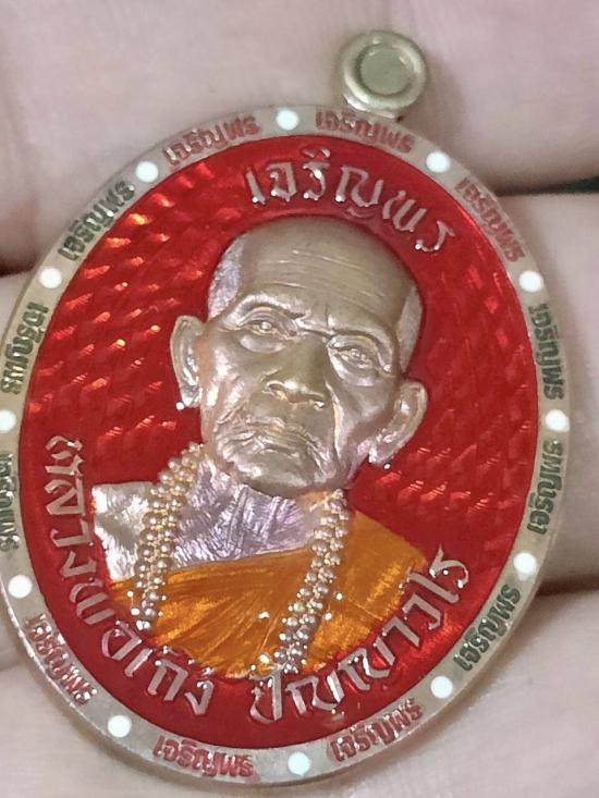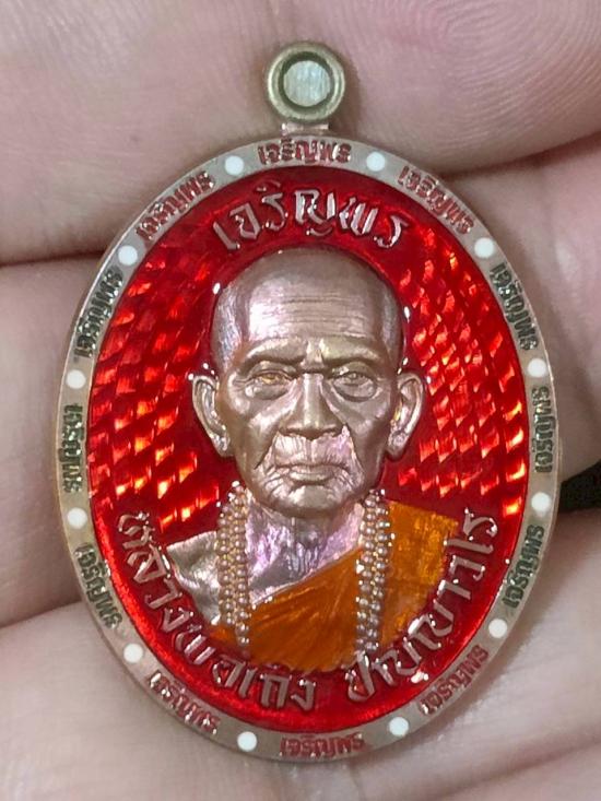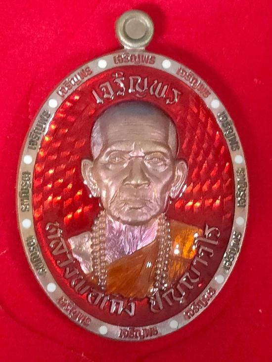 เหรียญเจริญพรบน หลวงปู่เถิง วัดบ้านอาลัย จ.ศรีสะเกษ เนื้อมหาชวนวผิวรุ้ง คุ้ยพื้นลงยาแดง ขอบธงชาติ ลงยาจีวร ตอกโค๊ต ช ตอกหมายเลข 65