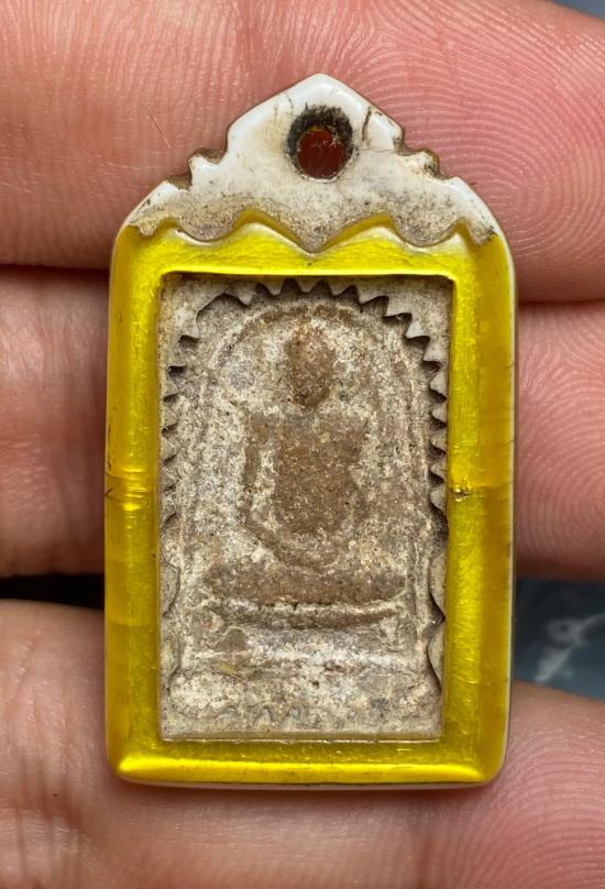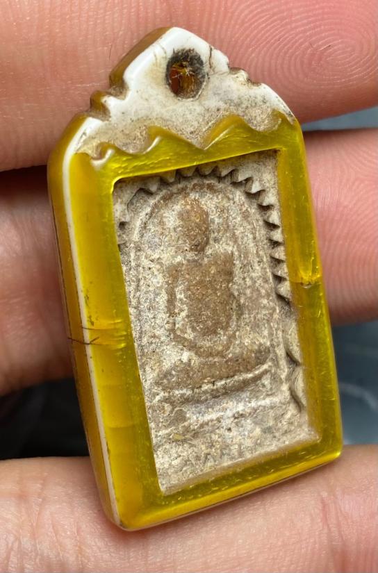 พระเนื้อผงรูปเหมือนเนื้อเก่า ด้านหลังมียันต์ พร้อมเลี่ยมห้อยใช้เก่าๆ มีคราบหิ้ง/ฝุ่นผงติด ไม่ทราบที่ครับ