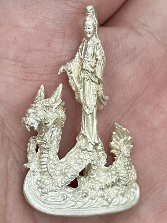 ชื่อพระเครื่อง กวนอิมหล่อ เนื้อเงิน ยืนประทับมังกร สวยงาม น้ำหนัก 12.53 กรัม