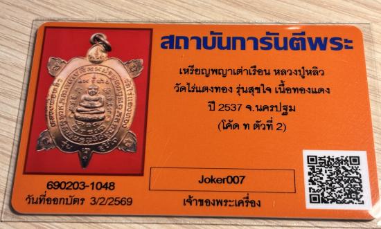 เหรียญพญาเต่าเรือนหลวงปู่หลิววัดไร่แตงทองรุ่นสุขใจเนื้อทองแดงพร้อมบัตรรับรองครับ