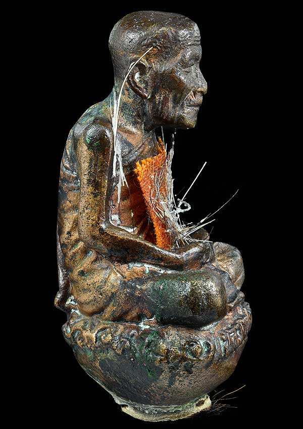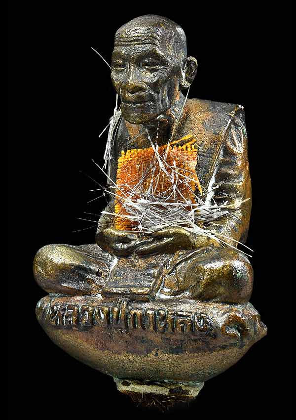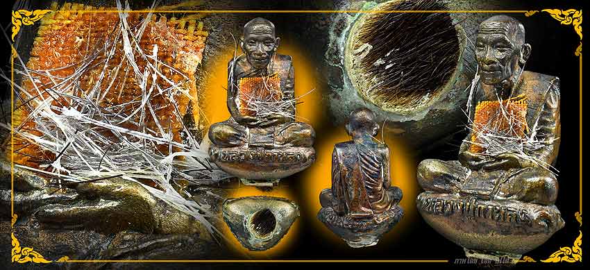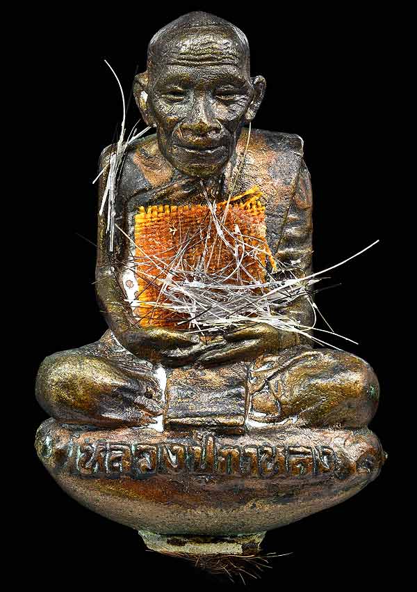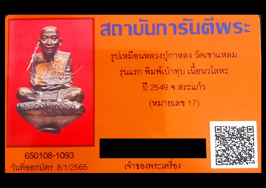 รูปหล่อโบราณ หลวงปู่กาหลง รุ่นแรก ปี 2549 มีโค๊ด และ เลข No.17 เนื้อนวโลหะขอมโบราณพันปี รุ่น "ครอบเศียรพระลักษมณ์2549"ใต้ฐานอุดผงปถมัง ปิดทับด้วยหนังเสือ ฝังเกศา จารยันต์ด้วยมือทั้งองค์ จำนวนสร้าง 4,999 องค์ |