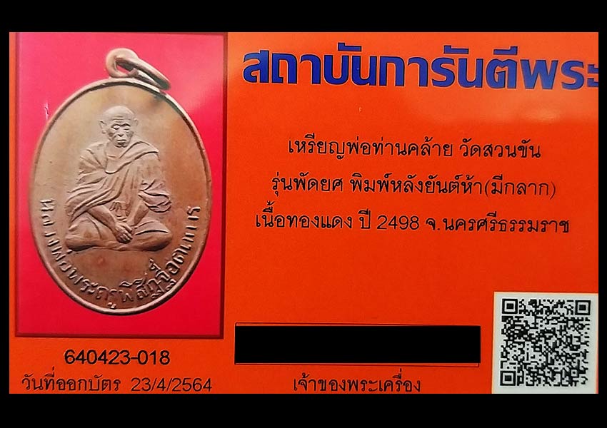 เหรียญพัดยศหลังยันต์ห้า(นะโมพุทธายะ) พ่อท่านคล้าย วัดสวนขัน ปี2498 นับเป็นพระเครื่องยุคแรกๆ เหรียญรุ่นพัดยศ (วัดสุทัศน์) หลังยันต์ห้า เนื้อทองแดง เป็นเหรียญที่ได้รับการแกะบล็อกแบบนูนต่ำโดยใช้รูปถ่ายต้นแบบที่ถ่ายโดยร้านเลี่ยงอิ้วที่จังหวัดภูเก็ต ปี2495 เหรียญพัดยศองค์นี้สภาพสวยตามรูป ปัจจุบันสภาพสวยๆหายากมาแล้วครับ