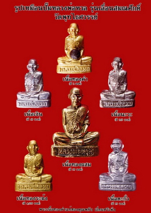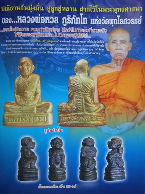 รูปเหมือนปั๊มหลวงพ่อหวล วัดพุทไธศวรรย์ เนื้อทองระฆังโบราณ(ชุบกะไหล่ทอง) จำนวนการจัดสร้างน้อย 4,999 องค์ จัดสร้างเนื่องใน วาระที่ หลวงพ่อหวล ท่านได้รับการแต่งตั้งเลื่อนสมณศักดิ์ที่ พระพุทไธศวรรย์วรคุณ เมื่อวันที่ 5 ธันวาคม 2551 ทางคณะศิษย์จึงใด้ขออนุญาตในการจัดสร้างวัตถุมงคล รุ่นเลื่อนสมณศักดิ์ ขึ้นโดยได้รวบรวมตะกรุดเก่าๆ ของหลายคณาจารย์ ของจังหวัดพระนครศรีอยุธยา พระปรุหนังและพระเนื้อชินที่ชำรุด ระฆังเก่าอายุหลายร้อยปี รวมทั้งเศษแร่ที่เหลือจาการสร้างวัตถุมงคลรุ่นก่อนๆ ของหลวงพ่อมาหลอม เพื่อเป็นชนวนในการสร้างรูปหล่อ รุ่นลื่อนสมณศักดิ์ และหลวงพ่อได้เมตตาอธิฐานจิตปลุกเสก ให้เมื่อวันที่ 23 กุมภาพันธ์ 52 จัดเป็นวัตถุมงคลของหลวงพ่อที่น่าบูชาครับ |