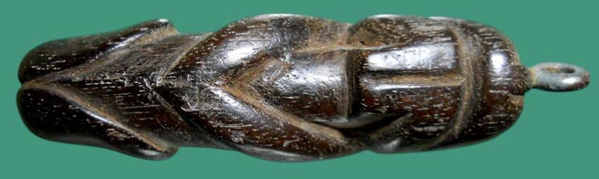 ปลัดขิกที่เห็นในภาพมีขนาดยาว 3 นิ้ว เป็นปลัดขิกยุคกลาง สร้างประมาณปี 2520 ต้นๆ ส่วนหัวอุดด้วยตะกรุดไผ่สาริกา (บางตัวอุดด้วยผง หรือตะกรุดทองแดงก็มี) มีรอยจารทั้งตัว ผ่านกาลเวลามานานพอสมควร เนื้อไม้จัดจ้าน แห้งคร่ำ สมอายุ ที่ก้นปลัดฯ เจ้าของเดิมได้ขันห่วงคล้องเอาไว้